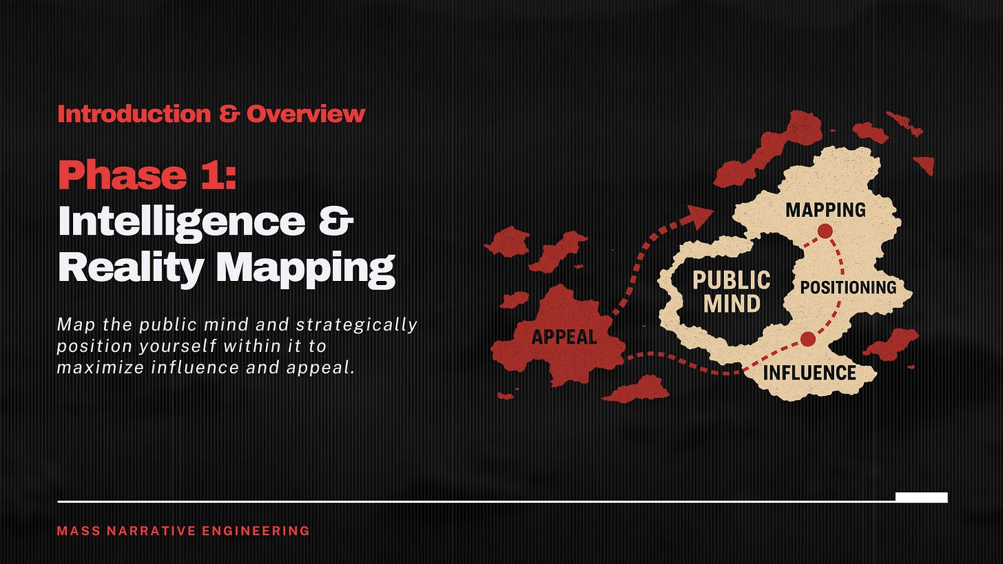 Mass Narrative Engineering is the framework for getting to that territory first, or taking it from whoever got there before you. It was developed by Jared T. Ross, Chief Propaganda Officer, as a systematic methodology for applying propaganda principles to business at the operator level.